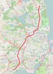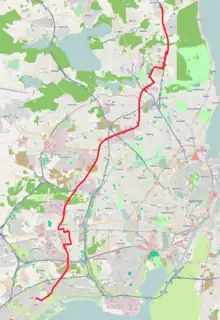 - Gammel Holte, Øverødvej - Helsingørmotorvejen - (< Vejporten < Lundtoftevej <) - Lundtoftegårdsvej -/ DTU, Rævehøjsvej - Anker Engelunds Vej - Lundtoftevej - Sorgenfrigårdsvej - Klampenborgvej - Lyngby Torv - Lyngby st. - Buddingevej - Gladsaxe Ringvej - Gladaxe Trafikplads - Gladsaxe Ringvej - Herlev Ringvej - Nordre Ringvej - Hovedvejen - Nyvej - Glostrup st. - Banegårdsvej - Østbrovej - Park Allé - Søndre Ringvej - Ishøj Strandvej - Ishøj Stationsvej - Ishøj st.[47]