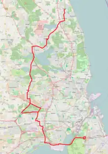 - Ørestad st. - > Ørestads Boulevard > Arne Jacobsens Allé > Center Boulevard >(/< Ørestads Boulevard < Hannemanns Allé < Center Boulevard <) - Øresundsmotorvejen - Amagermotorvejen - Avedøre Havnevej - Stamholmen - Gammel Køge Landevej - Borgmester Kjeld Rasmussens Boulevard - Brøndby Strand st. - Borgmester Kjeld Rasmussens Boulevard - Park Allé - Østbrovej - Banegårdsvej - Glostrup st. - Nyvej - Hovedvejen - Nordre Ringvej - Fabriksparken - Vestskovvej - Motorring 4 (/ Nordre Ringvej - Frederikssundsmotorvejen) - Motorring 4 - Sydbuen - Hold-an Vej - Linde Allé - Ballerup st. - Bydammen - Hold-an Vej - Skovvej - Ballerupvej - Værløse st. - Fiskebækvej - Frederiksborgvej - Farum Midtpunkt - Slangerupvej - Bistrupvej - Stationsvej - Birkerød st. - Stationsvej - Bistrupvej - Ravnsnæsvej - Frederiksborgvej - Usserød Kongevej - Højmosen - Ådalsvej - Kokkedal st.[40]