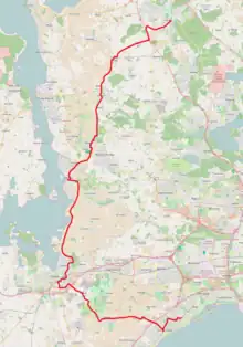 - Hillerød st. - Søndre Jernbanevej - Milnersvej - Peder Oxes Allé - Hillerødmotorvejen - Roskildevej - Borupvej - Stationsvej - Gørløse st. - Hovedvejen - Frederiksborgvej - Hillerødvej - Kongensgade - Slangerup Rutebilstation - Brobæksgade - Roskildevej - Maglemosen - Frederiksborgvej - Ølstykke st. - Frederiksborgvej - Udlejrevej - Gammel Roskildevej - Skrædderbakken - Værebrovej - Jyllinge Parkvej - Jyllingecentret - Jyllinge Parkvej - Frederiksborgvej - Risø - Frederiksborgvej - Østre Ringvej - Herregårdsvej - Østbyvej - Klosterengen - Byageren - Københavnsvej - Ny Østergade - Roskilde st. - Køgevej - Østre Ringvej - Vindingevej - Tingvej - Tunevej - Roskildevej - Nørregade - Tune Parkvej - Grevevej - Vesterbjerg - Greve Bygade - Greve Landevej - Greve Centervej - Greve st. - Greve Centervej - Lillevangsvej - Eriksmindevej - Godsvej - Hundige Centervej - Hundige Stationsvej - Hundige st.[29]