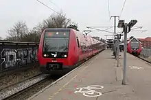 Cx![]() 2. generations S-tog på linje Cx på Hillerød Station i 1975. Da S-banen blev forlænget til Ballerup i 1949 nøjedes man i første omgang med enkeltspor mellem Herlev og Ballerup. Det var derfor kun muligt at forstærke driften frem til Herlev hvilket skete med linje A i myldretiden fra 1952.[1] I 1966 blev der imidlertid etableret dobbeltspor mellem Skovlunde og Ballerup og i 1970 desuden mellem Herlev og Skovlunde. Det udnyttede man 5. december 1966 til at oprette en ny myldretidslinje på Frederikssundsbanen, linje Cx, der kørte mellem Ballerup og Østerport og uden stop mellem Herlev og København H samt mellem Østerport og Hellerup.[17][2] To år efter, 26. maj 1968, tilsvarende en ny linje Ex, der kørte mellem København H og Hillerød og uden stop mellem Østerport og Birkerød. Mellem København H og Østerport blev den lagt i samme minuttal som linje Cx, hvilket medførte at visse tog fra Ballerup fortsatte til Hillerød som linje Ex og omvendt. De gennemgående tog var skiltet Ex i begge retninger og stoppede ikke i Hellerup i modsætning til de øvrige Cx-tog, der stadig endte der.[2] Ved en reform af linjenettet 1. oktober 1972 tog man konsekvensen af sammenfaldet mellem de to linjer og sammenlagde dem til en linje Cx mellem Herlev og Hillerød. Samtidig ændredes standsningsmønstret, så der nu kørtes uden stop mellem Jyllingevej og København H samt mellem Østerport og Holte. Det betød at linjen primært betjente stationer i forstæderne men ikke de store skiftestationer Valby, Vanløse og Hellerup.[3] Allerede 3. juni 1973 forlængedes linje Cx atter til Ballerup.[18] 25. september 1977 fik linjen et ekstra stop i Lyngby til erstatning for linje Bx, der var blevet omlagt til Farum i forbindelse med omstillingen af Hareskovbanen til S-bane. Derudover fortsatte linje Cx dog uændret.[19] En ny reform af linjenettet 28. maj 1989 betød imidlertid en kraftig amputation af linje Cx. Kørslen til Hillerød forsvandt til fordel for linje A og E og i stedet endtes nu på København H.[7] Videre kørsel til for eksempel Hellerup var ikke muligt, da der var fyldt op med linjer ad den centrale Boulevardbanen. I den anden retning ændredes stopmønstret desuden, så der nu kørtes uden stop mellem Valby og Jyllingevej.[7] Som sådan fortsatte linjen til 26. september 1993, hvor den nedlagdes og erstattedes af en ny linje H+ mellem Ballerup og Farum.[20] Det betød at Frederikssundsbanen fik udvidet sin ekstrakørsel fra myldretiderne til dagtimerne, hvilket erfaringer fra Køge Bugt-banen viste kunne øge passagertallene. Noget der var relevant på denne bane, hvor der var et forholdsvis stort passagerpotentiale.[21]