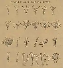 | XXII. Dioecia – særbo (= tvebo) Didandria, Triandria, Tetrandia, Pentandria, Hexandria, Octandria, Enneandria, Decandria, Icosandria, Polyandria, Monadelphia, Syngenesia, Gynandria fx Salix, Cannabis, Taxus, Silene dioica | |||