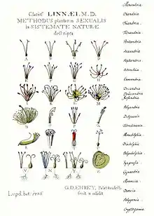 Linné fik den tyske botaniker og plantetegner Georg Dionysius Ehret til at lave en anskuelsestavle af sit system. Det skete allerede mens Linné studerede i Holland. I tabellen herunder bruges Ehrets tegninger.