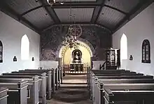 Koret fik indbygget krydshvælv i sengotisk tid, korbuen er ombygget men er stadig rundbuet og har nederst bevaret kvaderstensvangerne, skibet har fladt træloft fra ombygningen i 1866. I korhvælvet har man afdækket sengotiske kalkmalerier af den såkaldte Liljemester, der nærmest må opfattes som en fællesbetegnelse for jyske håndværksmalere i begyndelsen af 1500-tallet, den noget skematiske lilje nederst i hvælvkapperne ses i mange jyske kalkmaleridekorationer fra denne periode. I østkappen ses en noget naiv fremstilling af Livshjulet med de fire konger, der vil blive konge, er konge, har været konge og engang var konge, et Memento Mori (:husk du skal dø) om livets forgængelighed, desuden ses skematisk udførte rosetter. Kalkmalerierne blev restaureret af E. Lind i 1961. Den kalkmalede dekoration på triumfvæggen er udført af Johan Thomas Skovgaard i 1924, motiver er "Ligesom en hjort skriger efter vand," omkring korbuen står to hjorte, der drikker af vandet som udstrømmer fra korset over korbuen. Altertavlen er en kopi efter Bloch fra 1893. Prædikestolen er fra omkring 1600. En Mariafigur fra en sengotisk krucifiksgruppe er opsat på skibets vestvæg. Den romanske granitfont har glat kumme med tovsnoning omkring mundingsranden, den firkantede fod har kraftige hjørneudsmykninger.