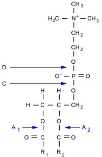 PLA1 og PLA2 fraspalter henholdsvis C1- og C2-fedtsyrerne, hvilket i begge tilfælde resulterer i et lysolipid og en fri fedtsyre. PLC og PLD fraspalter lipidets hovedgruppe.