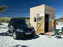 Frederikshavn Palmestrand. Livredder i sit tårn og med køretøj parkeret ved siden af.