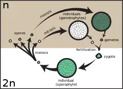 Under spore meiosen deler zygote sig mitotisk og skaber en flercellet, diploid "sporofyt". Sporofytten skaber sporer i to trin, først via meiose opfulgt af mitotiske delinger, sådan at der dannes individer, som kaldes "gametofytter". Gametofyttene danner dernæst gameter via mitose. Hos mange planter er gametifytten ikke bare lille, men også kortlivet.