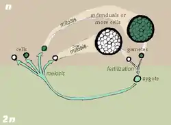 I hele denne livscyklus er gameterne oftest de eneste haploide celler, og mitose finder mest sted i den diploide fase.
