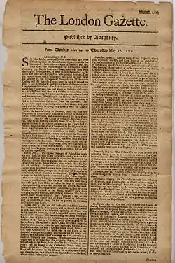 London Gazette og i øjeblikket ved at blive overført til digitalt format tilbage fra 1752, og kan ses online.[1][2]