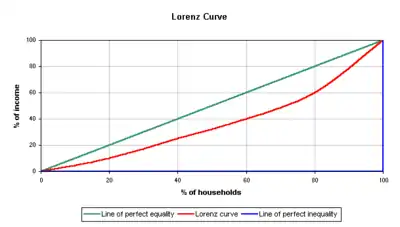 En Lorenz kurve (rød) mellem fuldstændig lighed (grøn diagonal) og fuldstændig ulighed (blå linje).
