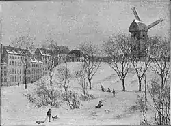 ![]() Volden ved det gamle Halmtorv (nuværende Rådhuspladsen) med Luciemøllen (også kaldet Lusse-møllen). | |