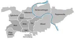 Bydelene er Pflugfelden, Eglosheim, Hoheneck, Neckarweihingen, Ossweil, Grünbühl-Sonnenberg, Neckarweihingen og Poppenweiler.
