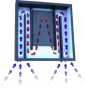 1: Indsugning gennem ventiler i bunden. Solventilation virker ved at suge luft ind i en ventilationskasse som set på billedet. Luften transporteres ind i solventilationskassen gennem de to ventiler. De er placeret nederst i hver sit hjørne. Derefter passerer luften gennem de viste kanaler, så løbebanen forlænges i forhold til kassens ydre størrelse. De to luftstrømme samles midt i kassen og blæses ud af kassen bag solcellen ind i et samlet rør. Ved passagen gennem kassen opvarmes luften løbende på samme måde, som en bil bliver varm i solen. Den opvarmede luft blæses derefter ind i boligen.