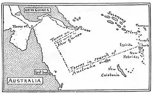 Pedro Fernandes de Queirós var en portugisisk født styrmand, som blev udpeget til at lede en ekspedition på 3 spanske skibe, San Pedro y San Pablo (150 tons), San Pedro (120 tons) og et mindre skib (patache) Los Tres Reyes. Den 21. december 1605 sejlede de 3 skibe ud fra Callao i det spanske Peru med Torres som kaptajn for "San Pedro." I maj 1606 nåede de øerne, som Queirós navngav La Austrialia (sic)[8] del Espiritu Santo (nu Vanuatu). Austrialia var et kompliment til det østrigske kongehus, som den spanske konge også tilhørte.[9]