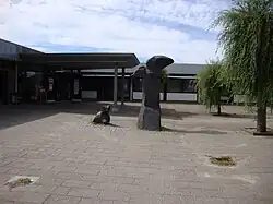 ![]() Foran hovedindgangen står en skulptur af en lokal stenhugger som også bruges som bogmærke for skolen. | |