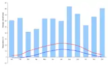 | Gnsn. daglig min-temperatur (°C) | -1 | -1 | 1 | 4 | 8 | 11 | 13 | 12 | 10 | 6 | 3 | 0 |