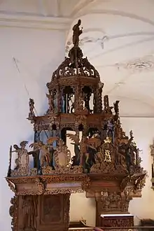 Lydhimmel i Holmens Kirke i pragtfuld udskåren barokstil. Her er den sammenbygget med prædikestolen.