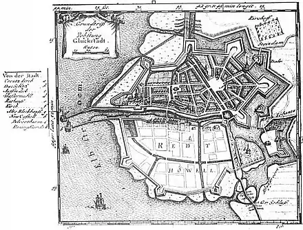Glückstadt i året 1652. Byens karakter af planlagt fæstningsby fremstår tydeligt. Ligeledes ses det, at store dele af de planlagte byareal endnu stod ubenyttede hen.