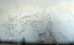 Romansk kalkmaleri fra omkring 1175, afdækket i 1975. Det forstiller to riddere i kamp og er formentlig en ikke færdiggjort skitse.