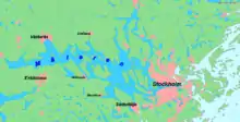 | Øer | Adelsö, Björkö, Bond-Arnö , Estbröte, Ekerö, Färingsö (Svartsjölandet), Helgeandsholmen, Helgö, Kungsholmen, Kurön, Kärsön, Lilla Essingen, Lovön, Munsö, Ridön (Södermanland), Ridön (Västmanland), Selaön, Stora Essingen |
