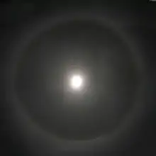 Som Solen kan også Månen give anledning til atmosfæriske virkninger, som omfatter en 22°-halo, og de lidt mindre og hyppigere koronaringe, som ses gennem tynde skyer.