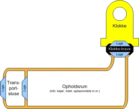 - Dykkeren kontrollerer at trykket uden for klokken er det samme som inden i klokken og såfremt det er åbner bund lugen og forlader klokken.