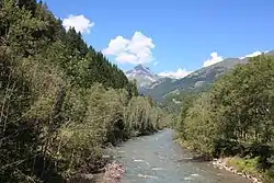 Rottau udligningsbassin. Til højre: Oberwasser-kanalen, der fører til Möll Valley Power Station. Venstre: den naturlige flodseng, som kun en lille del af vandet løber i.