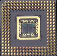 Foto af MIPS-mikroprocessoren IDT R4700, fra 2007, set fra undersiden. Man kan se mange ben og selve mikrochippen i midten.
