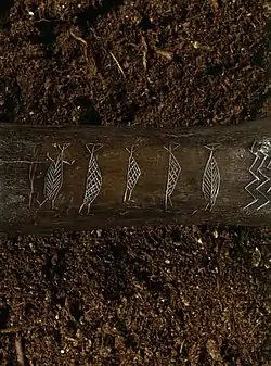 ![]() Ornamenteret kølle (urokseknoglen fra Ryemarksgård, Jystrup Sogn), der antagelig viser en jægerfamilie bestående af to mænd og tre kvinder.[1] | |