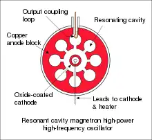Magnetronen har en central katode og i en ring uden om sidder anoden. Et magnetfelt tvinger elektronerne, der udsendes af katoden, til at bevæge sig rundt om denne. Hulrum i anoden fungerer som resonatorer og frembringer svingningerne. Hvis magnetronen er forsynet med ferritstænger, kan man indstille frekvensen inden for visse grænser ved at påvirke disse stænger med et magnetfelt. Ellers har den en fast frekvens.