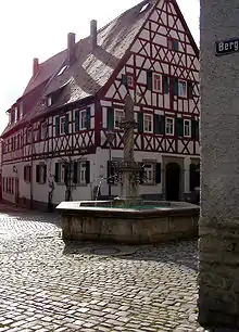 Vierröhrenbrunnen og bindingsværkshus i centrum af Mainbernheim