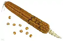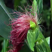 ![]() Majs (Zea mays). Den hunlige blomsterstand under udvikling af kerner.  | |