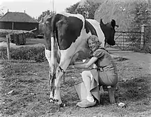 En nederlandsk malkepige malker en ko.