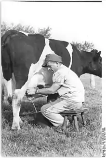 Malkende bonde på firbenet malkestol