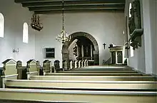 Skibet har fladt loft, koret har hvælv fra sengotisk tid. Korbuen er bevaret med profilerede kragsten, mod nord ses Korslam og rankeværk, mod syd ses en løve og rankeværk. Altertavlen er fra omkring 1600, i felterne ses malerier af Wenzel Tornøe. Prædikestolen er fra nyere tid. På en mankestol ses en kvindeskikkelse med svajet krop i byzantinsk stil. Den romanske døbefont af granit har glat kumme med tovsnoning øverst.