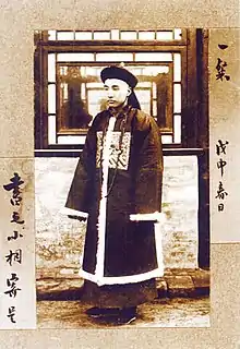 Et Qing-fotografi af en embedsmand med Mandarinduk i forgrunden.