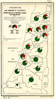 FN's estimat i 1945 over dyrket jord viser, at i gennemsnit 68% var ejet af arabere i hvert distrikt, fra 15% i distriktet Beer-Sheba til 99% i Ramallah. Til sammenligning var stadig i 1951 kun 0,3% af den registrerede jord kategoriseret som "privat ejendom" i nabolandet Irak.[82]