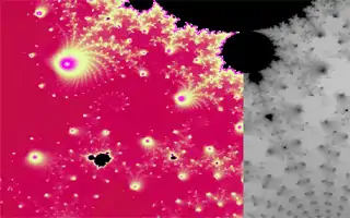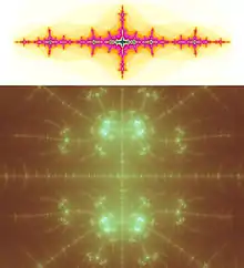 ![]() Zoom i mandelbrotmængden, hvor det kan ses at man kan finde mandelbrotmængden selv i mandelbrotmængden.  |