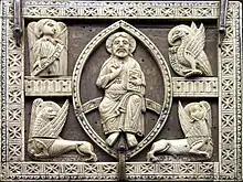 Majestas Domini i en mandorla, omgivet af evangelisternes attributter. Elfenbenplakette på skrin af træ. Köln, første halvdel af 1200-tallet i Musée de Cluny