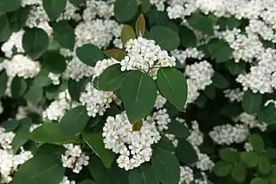 Barken er først behåret og derfor grålig. Senere bliver den mørkerød, og til sidst er den sort og svagt furet. Knopperne er spredte, tiltrykte og tæt behårede. De ser lidt åbne og lasede ud. Bladene er ægformede med hel og bølget rand. Oversiden er grågrøn, mens undersiden er lyst grøn og næsten hårløs. De talrige, hvide blomster sidder samlet i oprette halvskærme ved bladhjørnerne. Duften er kraftig og tung. Frugterne er røde bæræbler, der næsten dækker busken i efteråret. Frøene modner godt og spirer villigt i Danmark.