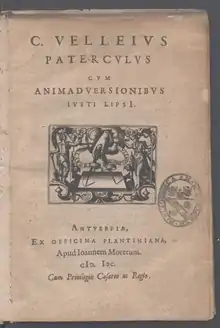 Editio princeps af Velleius Paterculus bøger er bevaret i et dårligt afskrevet og ødelagt manuskript fundet af Beatus Rhenanus i 1515 i Murbach Kloster i Alsace. Det er gået tabt igen. Der er udgaver af en række store humaniser, Justus Lipsius (1547-1606), Jan Gruter (1560-1627), Nikolaes Heinsius den ældre (1620-1681) og Pieter Burmann den ældre (1668-1741).