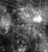 ![]() Mare Insularum, grænsende til kraterne Copernicus mod øst og Kepler mod vest. Oceanus Procellarum støder op til det mod sydvest. Den nordlige rand af Mare Cognitum ses i billedets bund, og Fra Mauro er det grå område nederst til højre. | |
