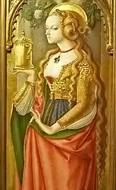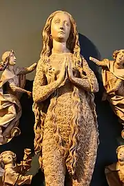 Detalje af Maria Magdalene, der græder ved Jesu korsfæstelse, som portrætteret i The Descent from the Cross omtrent 1435) af den flamske kunstner Rogier van der Weyden[42]