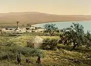 Foto taget omtrent år 1900 af al-Majdal, en landsby i Tiberias, der står blandt ruinerne af Magdala, Maria Magdalenes hjemby.[11][12][13]