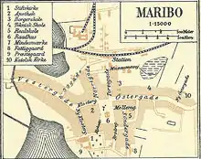 - Denne linjeføring ses på bykortet over Maribo fra omkring 1900, hvor der også var et sidespor til Mariebo Dampmølle
