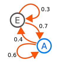 Et diagram, der viser en Markov-proces med de to udfald E and A. Hvert tal viser sandsynligheden for udfaldet af en ændring af tilstanden. Er Markov-processen i tilstand A, er sandsynligheden for at den ændrer sig til E 0,4 og sandsynligheden for at den forbliver i tilstand A 0,6.