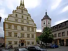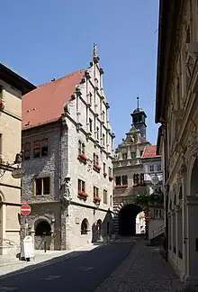 - Rådhuset der er sammenbygget med den gamle byport, opført 1587–1600