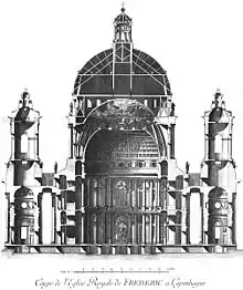 Da Eigtved døde 7. juni 1754, blev Thurah indsat som leder af byggeriet, men det lå stille, indtil Jardin blev hentet til landet og overtog ansvaret den 1. april 1756. Byggeriet blev videreført efter Jardins egne tegninger, som han publicerede i form af graveringer i hhv. 1765 og 1769 under navnet Plans, coupes et élévations de l'église royale de Fréderic V. (Se links.)