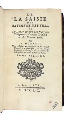 I søkrigene mellem England og Frankrig hævdede den engelske regering disse regler, som de engelske kapere anvendte med en sådan vilkårlighed, at den neutrale skibsfart, navnlig i Syvårskrigen, næsten led lige så meget derunder som den fjendtlige. Allerede i sit første betydelige arbejde, Essai sur l'histoire du droit naturel (London 1758), havde Hübner. kort fremsat sine afvigende anskuelser, og han begrundede dem nærmere i sit berømte værk: De la saisie des bâtiments neutres, som udkom i Haag 1759. Hans udgangspunkt er, at krigen ikke berører de neutrales retsstilling, uden for så vidt de selv ved at erklære sig neutrale have pålagt sig den pligt ikke at yde nogen af de krigsførende direkte og umiddelbare midler til krigens førelse.