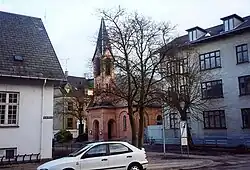 Kirken er oprettet for den af pastor N.P. Grunnet 1855 stiftede evangelisk-lutherske menighed, der hører til frikirken i Danmark. Den er opført 1877 (grundsten nedlagt 18. marts, indviet 19. august) for ca. 30.000 kr. (1900-kroner) efter tegning af arkitekterne Alfred Jensen og August Johansen på granitsokkel af røde mursten med tårn med spir (70 fod højt), ved gavlen ud til gaden og tilbygning med tværgavle ved korenden. Det indre har orgel, over indgangen tøndehvælv. Krucifiks på alteret og et maleri Christus over kornichen. Der er ca. 140 pladser.
