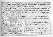 Deres rådgivere, Deres Majestæt har arvet fra Deres forgænger, er ikke i besiddelse af folkets tillid, lige så lidt i det egentlige Danmark, som i Slesvig og Holsten; de daglige mere fremtrædende sørgelige frugter af deres regeringssystem har måttet undergrave enhver tro på, at de nu skulle besidde indsigt og kraft til at frelse landet. Afgørelsens time nærmer sig med kæmpeskridt. Staten vil opløses, dersom Deres Majestæt ikke uopholdeligt omgiver Deres trone med mænd, som er opgavens storhed voksne, og som kunne tilføre regeringen en energisk vilje og nationen bistand - mænd, der kunne redde Danmarks ære og grundlægge landets frihed. Vi anråber Deres Majestæt om ikke at drive Nationen til Fortvivlelsens Selvhjælp |